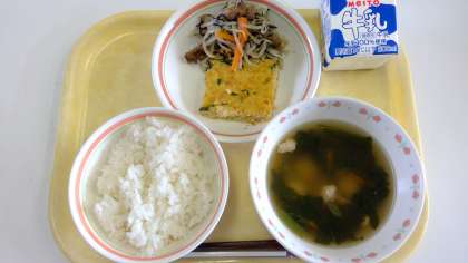 今日の献立は、ごはん・擬製豆腐・ひじきサラダ・月見汁・牛乳です。今日は、旧暦の8月15日、中秋の名月ということで『白玉団子』入りの月見汁を献立に入れました。朝に降っていた雨も上がり、夜にはきれいなお月さまが見られそうです。