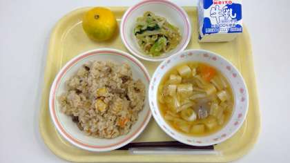 今日の献立は、秋のかおりごはん・お浸し・田舎汁・早生みかん・牛乳です。早い時期にとれるみかんを『早生みかん』といいます。皮が青っぽく、酸味が強いのが特徴です。