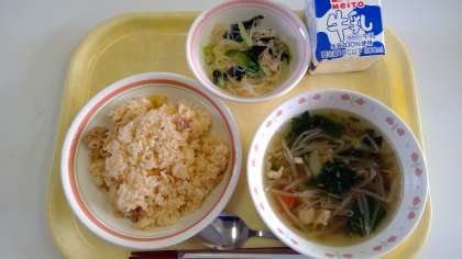 今日の献立は、キムチたくあんごはん・春雨サラダ・もやしのスープ・牛乳です。1年生のクラスで配膳中、『キムチ苦手』『洗って食べた』との声があり、辛くないから1口食べてみてねと伝えました。その後、最初は少なめにしていた児童もお替りしていたと担任の先生から伺いました。