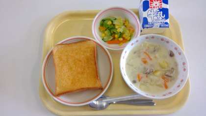 今日の献立は、ハニートースト・さつまいものシチュー・コーンサラダ・牛乳です。パンの回数が少ないので、楽しみにしている児童が多いようです。今日は、バターと蜂蜜をたっぷり塗った『ハニートースト』でした。