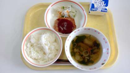 今日の献立は、ごはん・れんこん入りハンバーグ・大根サラダ・はんぺん汁・牛乳です。みずみずしい大根が届きました。今日はさっぱりフレンチドレッシングで和えた『大根サラダ』です。