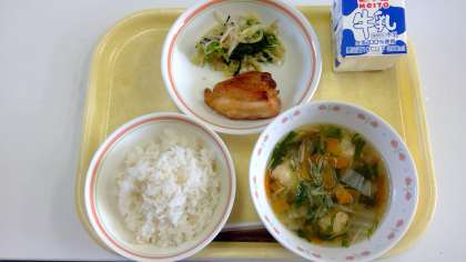 今日の献立は、ごはん・鶏肉の西京焼き・お浸し・えびしんじょ・牛乳です。えびしんじょは一つ一つスプーンで形をつくり、蒸してからすまし汁に加えました。