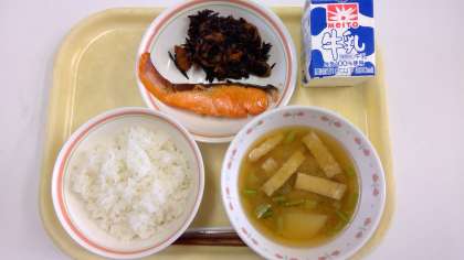 今日の献立は、ごはん・鮭の幽庵焼き・ひじきの土佐煮・味噌汁・牛乳です。和食給食の最終日は、紀風・城田シェフによる『鮭の幽庵焼き』と賛否両論・笠原シェフによる『ひじきの土佐煮』でした。