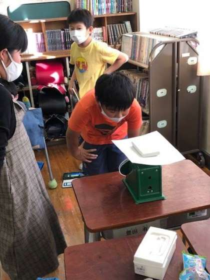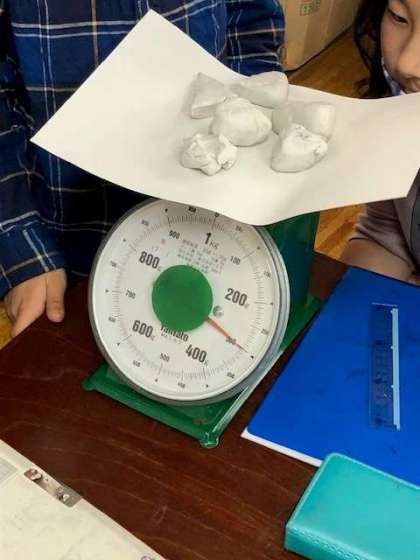 「物の重さをくらべよう」の単元です。目標は「実験結果を基に、物は置き方や形を変えても重さは変わらないと考え、自分の考えを表現する」です。子供たちは予想を基に、一枚の粘土板を様々な形に変えて重さを量っていきました。実験する前はなんとなくそうだろうと思っていた子供たちも、実際に実験をするたびに「なるほど」を理解を深める顔が印象的でした。授業の最後は、自身の生活に結び付けるために、希望者が体重計に乗り、ポーズを変えても重さは変わらないことを和やかな雰囲気で学んでいました。
