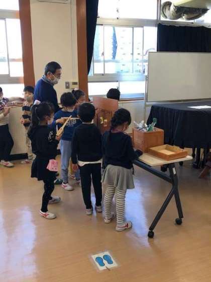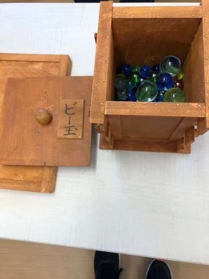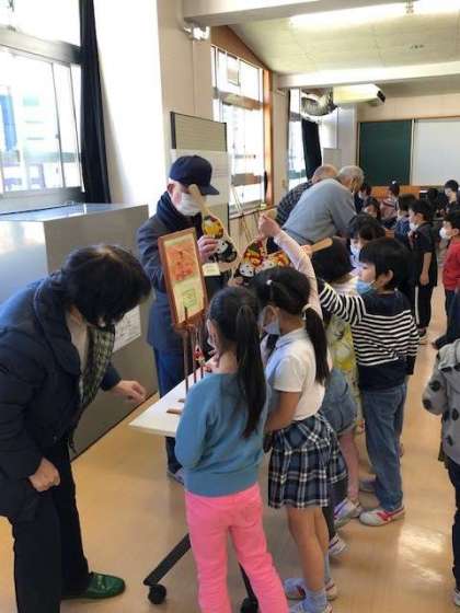 17日(水)に、1年生の生活科の単元の「昔あそびをしよう」で、本校の同窓会の方に来校していただき、昔の子供たちがよくしていた遊びを紹介してもらいました。「ビー玉」や「おはじき」「割りばし鉄砲」「ベーゴマ」など、懐かしいおもちゃを同窓会の方が用意していただきました。写真にもありますが、入れ物も手作りで趣があります。感染症対応の為、遊び時間は少なかったですが、子供たちは昔遊びを「新しい気持ち」でワクワクしながら楽しんでいました。