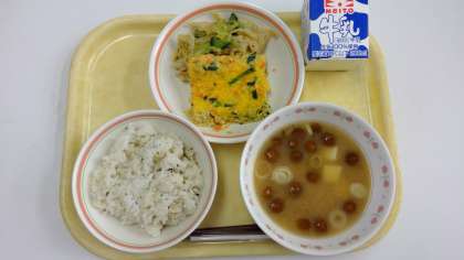 今日の献立は、菜飯・千草焼き・キャベツのおかか和え・豆腐となめこの味噌汁・牛乳です。普段、汁物には木綿豆腐を使用していますが、今日はなめこに合わせ『絹豆腐』を使いました。