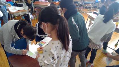 外国語活動では、オリジナルのパフェの絵を作るために、英語を使って、欲しい物を伝え合う活動をしました。思い思いのパフェを作っていて、とても意欲的でした。