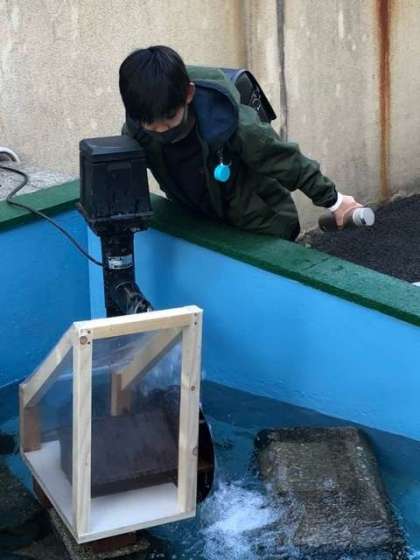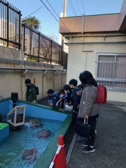 富谷は「春の小川」のもとになった「河骨川」そして「宇田川」が流れていました。今は暗渠になっています。創立90周年事業で本校ビオトープ(カメの池)の改修や「春の小川」の歌詞を壁に書いたことは、以前HPでお伝えしました。この度、本校の主事さんが学校の廃材を利用し、「水車」を手作りで作ってくれました。本日ビオトープに設置。子供たちは小さいながらも精巧な水車に驚いていました。