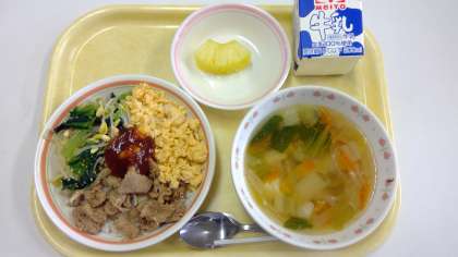 今日の献立は、ビビンバ・華風スープ・パイン・牛乳です。ビビンバは、味噌ダレつきのバージョンにしました。甘辛いタレで野菜も沢山食べることができます。