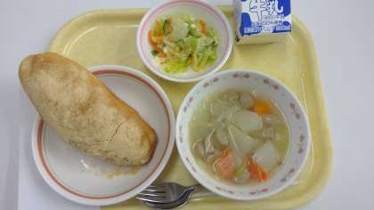 今日の献立は、揚げパン・ポトフ・チーズサラダ・牛乳です。給食に使われている、ベーコンやソーセージは『発色剤』不使用のものを使用しています。