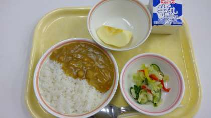 今日の献立は、ビーンズカレー・カラフルサラダ・りんご・牛乳です。いつものカレーに中濃ソースを加えスパイシーに仕上げました。野菜も含め、よく食べていました。
