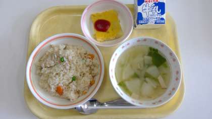 今日の献立は、鶏ごぼうピラフ・ポテト入りオムレツ・かぶのスープ・牛乳です。和風料理によく使われる『ごぼう』と鶏肉をバターでさっと炒めピラフにしました。