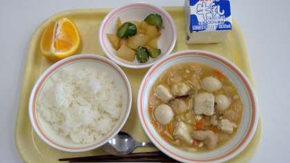 今日の献立は、シャーレン豆腐・大根の華風漬け・デコポン・牛乳です。シャーレン豆腐と華風漬けは、他校の栄養士さんにレシピをいただきました。