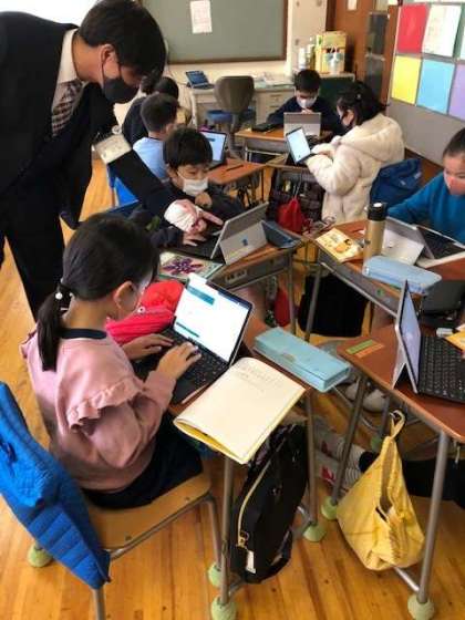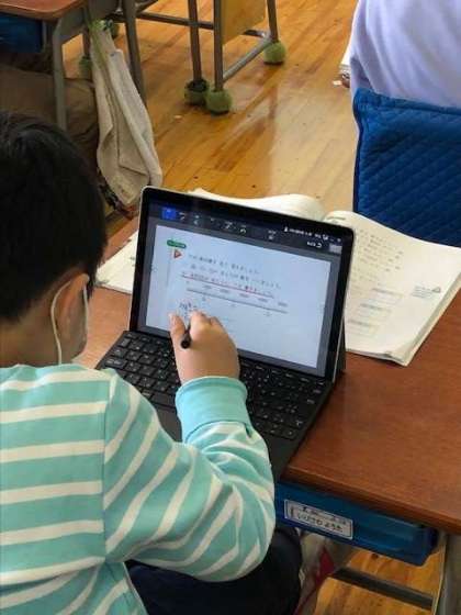 写真であるように、全クラスがタブレットを活用した授業を行いました。低学年でもタッチペンを使用するなど、この1年でタブレット使用は手馴れてきているようです。5時間目の5年生の算数の授業は、「円の円周」を求める学習でしたが、写真で分かるように、具体物を使って円周を調べる活動を行いました。タブレットはあくまでも「文房具の一つ」です。タブレットとともにアナログ的な活動も取り入れながら、学習のめあてを子供たちが達成できるように、しっかりと計画を立てて学習を進めていきます。