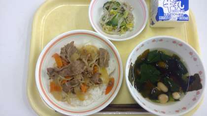 今日の献立は、牛丼・ゆかり和え・すまし汁・牛乳です。コロナウイルス感染拡大により、消費が落ちてしまった『和牛』を、国の政策として給食で提供することになりました。