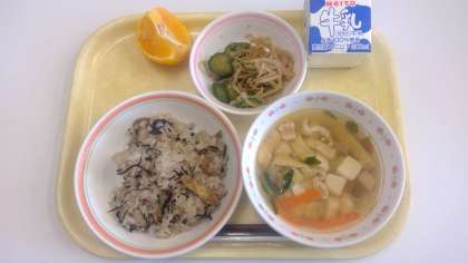 今日の献立は、ひじきごはん・もやしときゅうりのおかかあえ・きのこと豆腐のすまし汁・デコポン・牛乳です。昆布と厚削りで丁寧にとった『だし汁』を加えてひじきごはんを炊きました。