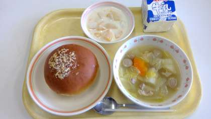 今日の献立は、カレーパン・ポトフ・フルーツヨーグルト和え・牛乳です。形よく仕上げるため、タイミングを見てじゃがいもを入れています。
