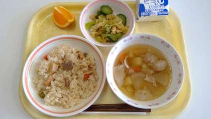 今日の献立は、五目鶏ごはん・キャベツのおかか和え・根菜ごま汁・清見オレンジ・牛乳です。おかか和えは、醤油に少量の砂糖を加えるのがポイントです。
