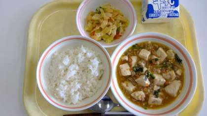 今日の献立は、発芽玄米ごはん・麻婆豆腐・パリパリサラダ・牛乳です。ワンタンの皮を短冊切りにし、油で揚げてサラダにトッピングしました。人気メニューの一つです。