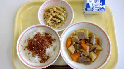 今日の献立は、ごはん・かつおでんぶ・筑前煮・切干大根のごま酢和え・牛乳です。『ふりかけ』がつくとごはんの残が少なくなります。