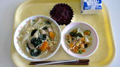 今日の献立は、かきたまうどん・ツナ和え・ぼたもち・牛乳です。春のお彼岸献立として『ぼたもち』を手作りしました。