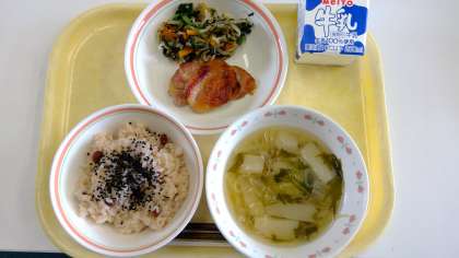 今日は卒業お祝い献立、赤飯・鶏肉の西京焼き・磯和え・はんぺんのすまし汁・牛乳です。日本では昔からお祝いごとがあると『お赤飯』を炊いて祝う風習があります。