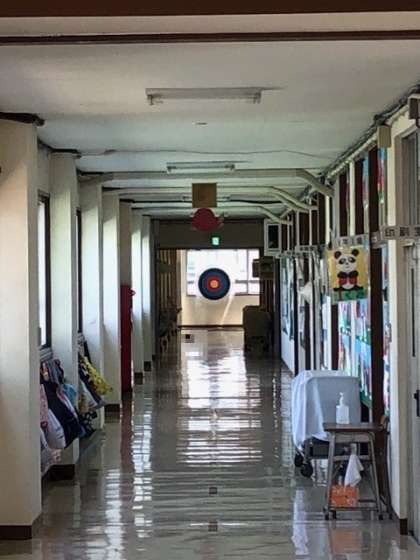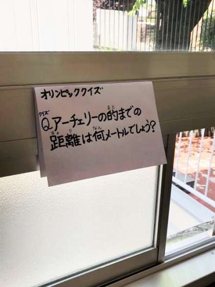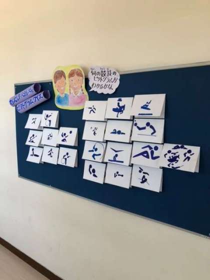 本校のオリ・パラ部会の先生方が子供たちと一緒にユニークな掲示を作成しました。写真にありますが、2階の掲示板にオリ・パラ種目の「ピクトグラム」を掲示しています。競技を絵で表したものです。イラストをめくると、その競技の説明を見ることができます。また、廊下の突き当りに「アーチェリーの的までの長さ」に関する問題があり、それをめくると「70m」と書いてあります。実は、2階の廊下の端から端まではちょうど70mのようで、その反対側にその的が実物大で掲示が!写真でも分かるように、その距離には驚きです。