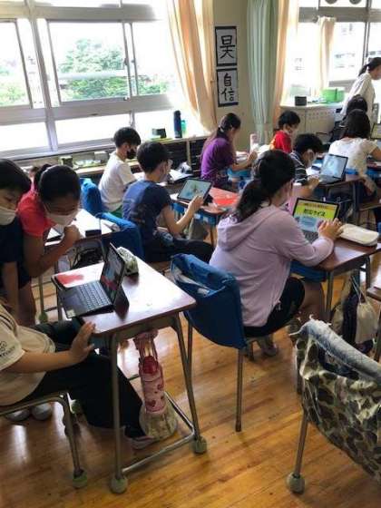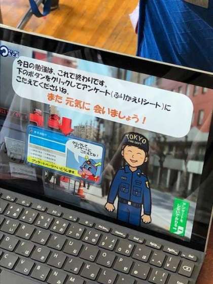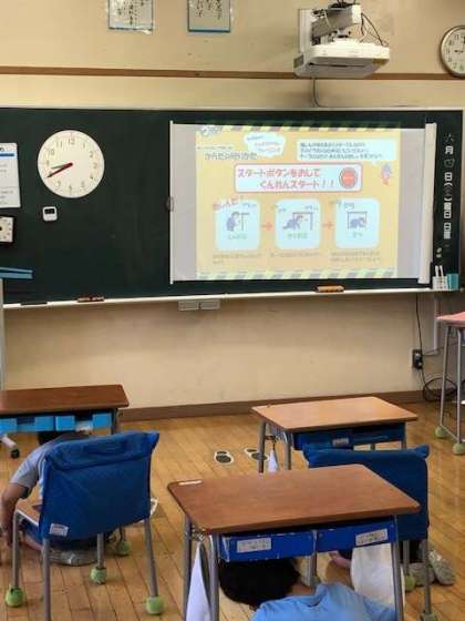 東京消防庁渋谷消防署が防災教育に関するタブレット用教材を作成し、各学校に配布されました。今回の内容は地震に関するものですが、児童用タブレットにダウンロードでき、各個人で防災教育を受けることができます。防災の基礎知識理解やクイズなどがあり、子供たちは各自で学習を進めていました。また、「シェイクアウトトレーニング」といって、実際に地震が起こった時の体験活動も行うことができます。写真のように、体験を全体で行っていたクラスもありました。