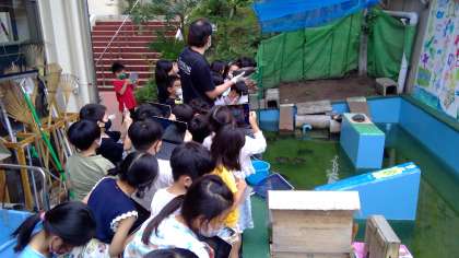 生活科では、虫やカエルなどの生き物の様子について調べたり、教室で飼育して観察したりしています。先日、主事さんに学校の亀の生態についてお話していただきました。写真を撮ったり、メモに記録したりと集中して話を聞いていました。