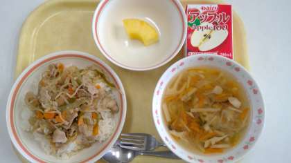 ・スタミナ丼 ・春雨スープ ・パイン ・りんごジュース