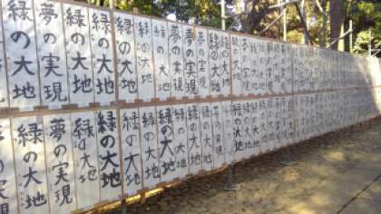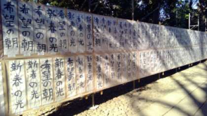 写真は、代々木八幡宮の参道で開かれている児童書き初め展の様子です。本校の5・6年生の作品を展示していただいています。