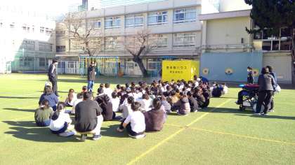 今日は、避難訓練がありました。地震の後、給食室から出火したという想定で行いました。