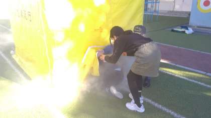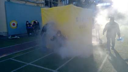 避難訓練の後、5年生は、消防署の方の協力のもと、煙ハウス内を歩く体験をしました。煙ハウスとは、テントの中に体に無害な煙を充満させ、火災が発生したときの状況を再現したものです。