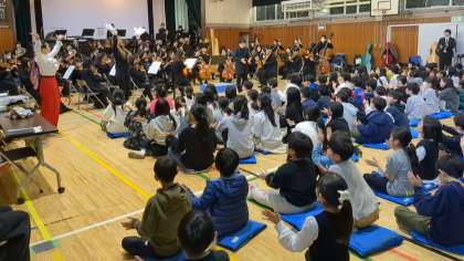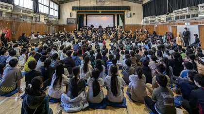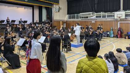 文化庁の学校巡回公演事業で「パシフィックフィルハーモニア東京」の皆さんをお呼びし、オーケストラ鑑賞教室を開くことができました。総勢70名の楽団員の方が来てくださり、体育館がコンサートホールのようになりました。