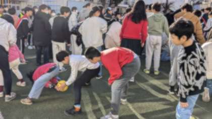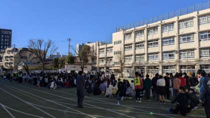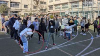 学級ごとに2列に並び、前の人から手をつないだままフラフープを後ろの人まで送ったり、ボールを足の下にくぐらせて送ったりするゲームでした。学級対抗で2回戦行ったので、早く送ろうと声をかけ合って工夫する姿が見られました。