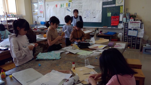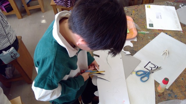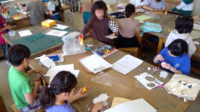 この時間は、版の刷り上がりをイメージしながら、自分で考えた形に切り取った紙の上に「でこぼこ」を付けていました。紙の切り方や貼り方をいろいろと考えながら活動を進めていました。