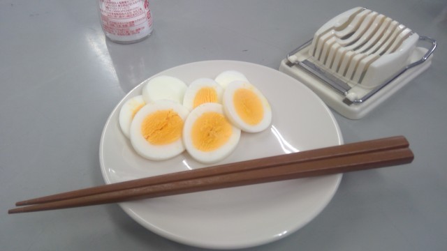 卵をゆでる時間は9分、12分、15分の3パターンとし、自分の好きなゆで時間を選んで調理を進めました。ゆで終わると卵の殻を優しくむいて塩を振り、おいしくいただきました。