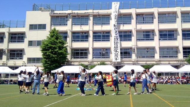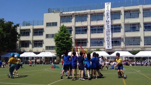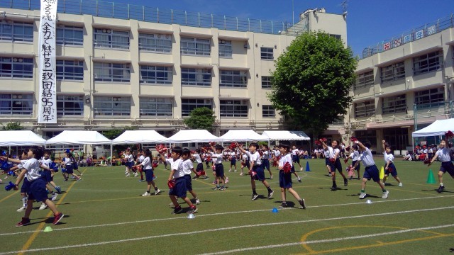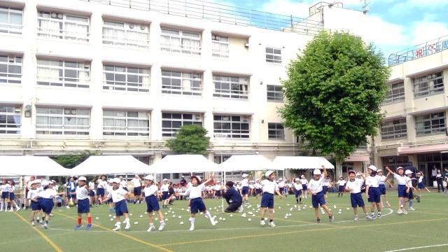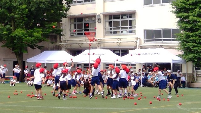 1年生の競技「ダンシング玉入れ」では、「ジャンボリーミッキー」の音楽に合わせた踊りを間にはさんで玉入れをしました。会場中が一気に笑顔になりました。そして、玉の数を数えるときも、「1、2、3・・・」と全校のみんなが声を合わせていて、一体感が生まれました。