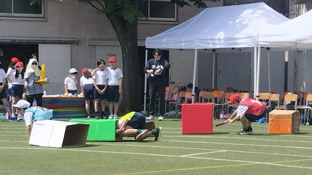 4年生の競技「走ってくぐりぬけろ!ハーフリレー」は、子供たちの発想から生まれた競技です。全力で走るコースと、段ボールの中をくぐりぬけたり、先生とじゃんけんをしたり、コーンをタッチしながらジグザグに走ったりするコースとがあり、リレーの最中に逆転する楽しさがありました。