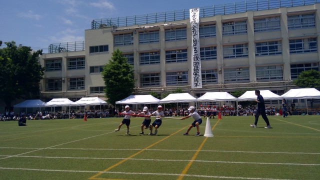 3年生の競技は、「絆でつなげ!!台風の目」でした。棒を持った4人で息を合わせて走ること、コーンを回るときの役割分担、そして、棒をタイミングよく跳び越えたりしゃがんでかわしたりすることが大切な競技です。