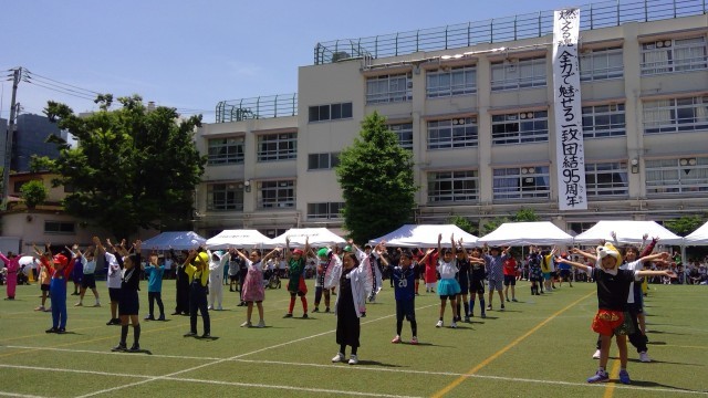 6年生の演技「友情の絆 ~協力と朝鮮の大冒険」は、実行委員を中心に子供たちが一から創り上げた演技です。踊り込み、動きをぴたっと合わせることを意識して「魅せる」演技に仕上げました。退場時には、担任たちとハイタッチをして満面の笑顔を見せていました。