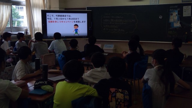 代表委員会の児童が「廊下は右側を歩こうキャンペーン」を企画しました。