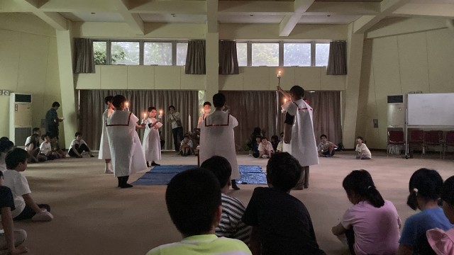 宿舎では、キャンドルファイヤーを行いました。猛獣狩りゲームなどを通して、他の学校の友達ともたくさん交流することができました。