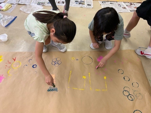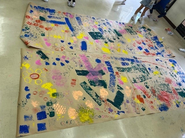大きな紙にみんなでスタンプしていくと、だんだん作品になっていきました。最後にはカラフルで個性的な作品ができあがって、みんなとても満足していました。