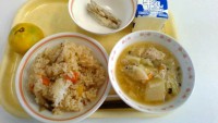 ・秋の香りごはん・きびなごのから揚げ・鶏つくねの豆乳スープ・みかん・牛乳