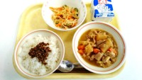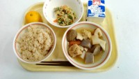 ・かつおふりかけごはん・鶏肉とこんにゃくの味噌煮・切り干し大根のごま酢あえ・牛乳