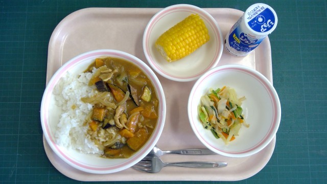 夏野菜のカレーライス、野菜サラダ、ゆでとうもろこし、牛乳