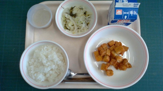 ごはん、凍り豆腐と鶏肉のチリソース、野沢菜和え、いちごミルク寒天、牛乳