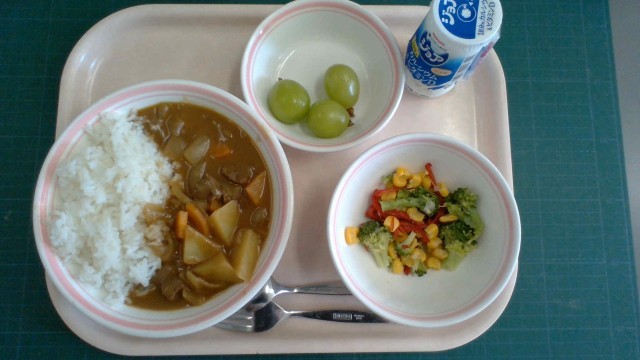 ビーフカレーライス、フレンチサラダ、シャインマスカット、牛乳