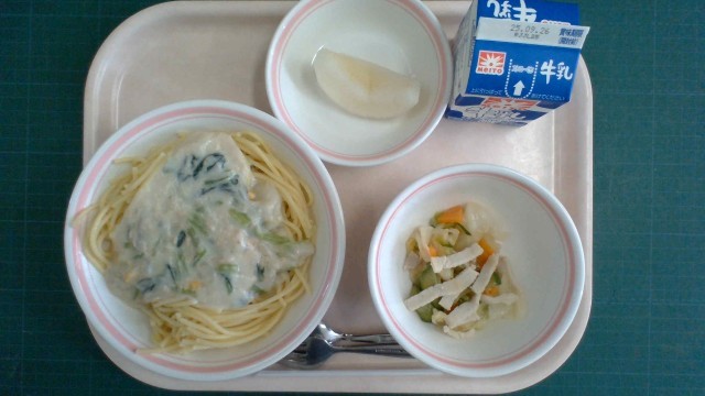 〈今日の給食〉9月19日(金) 公開日 2025/09/19 更新日 2025/09/19 給食だより こまツナクリームパスタ、キャベツとハムのサラダ、梨、牛乳〈産地〉にんにく:青森県たまねぎ:北海道こまつな:茨城県キャベツ:長野県きゅうり:秋田県にんじん:北海道なし:栃木県